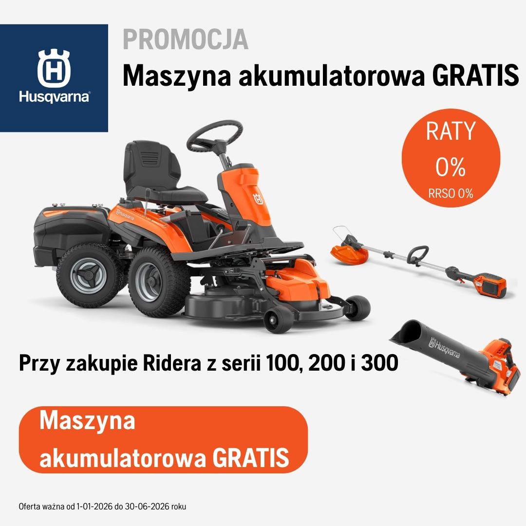 Tylko teraz, przy zakupie wybranych riderów Husqvarna, dodatkowa maszyna akumulatorowa gratis. Oferta ważna do 31.12.2026 roku lub wyczerpania zapasów.